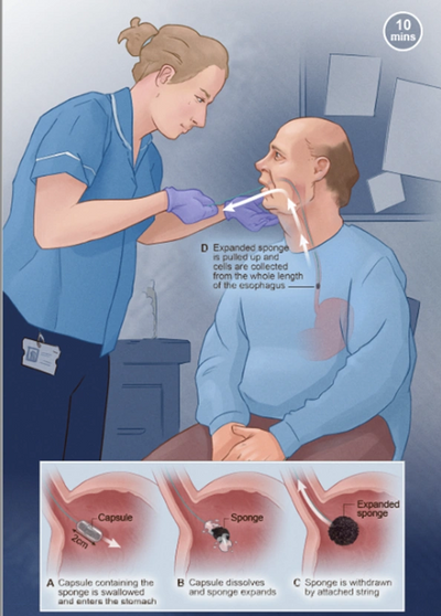 With the help of a trained nurse, the capsule and thread are swallowed with a glass of water. After 7 minutes, the capsule dissolves in the stomach, releasing the sponge. The trained nurse then removes the sponge by pulling on the thread. As it is pulled out, the sponge collects cells from the oesophagus.